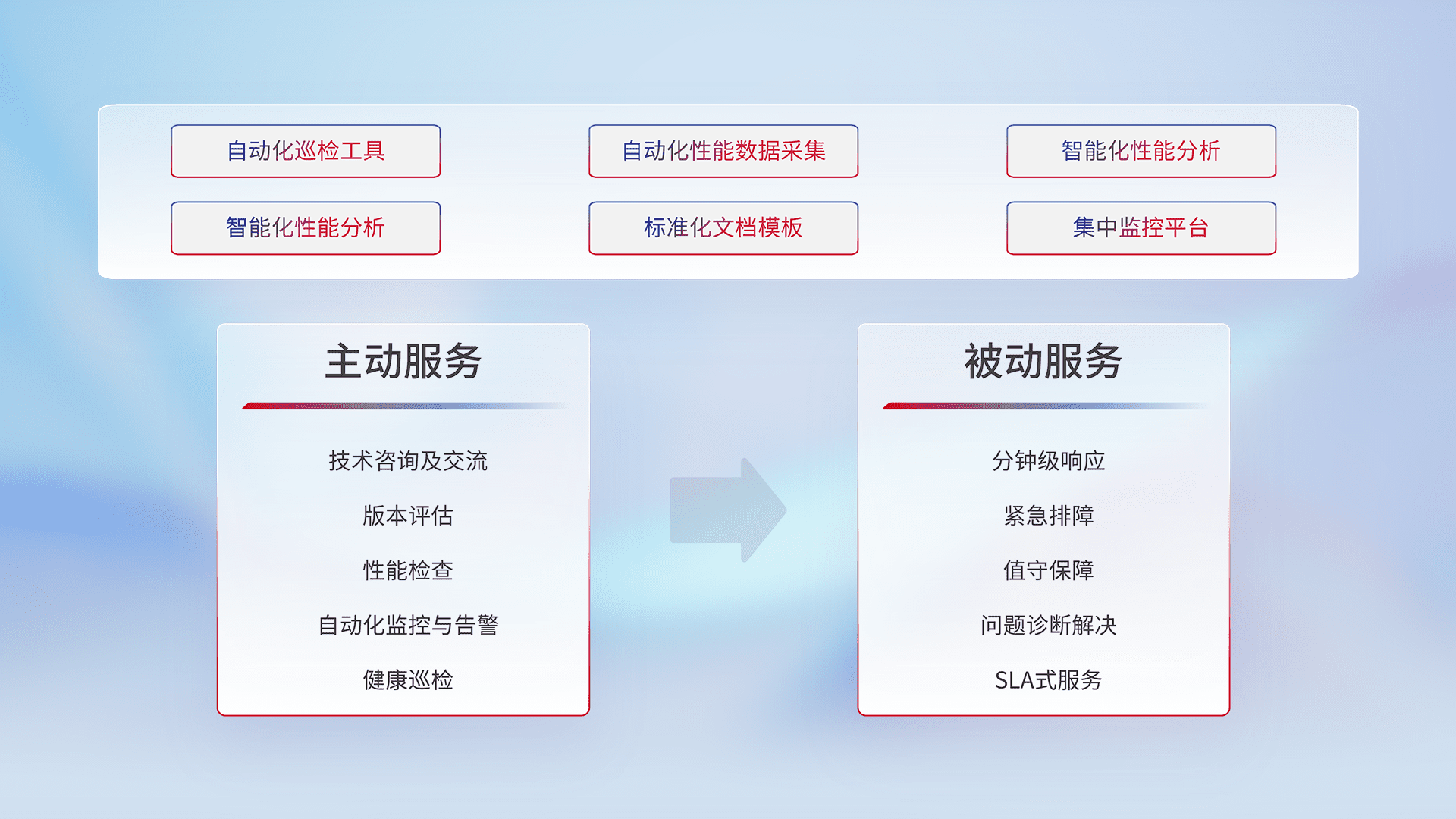 智能化工具和标准化文档,,,保障服务质量,,,提供主动服务(包含技术咨询、、版本评估、、、、性能检查、、、自动化监控与告警、、、、健康巡检)和被动服务包含(分钟级响应、、、紧急排障、、、、值守保障、、、问题诊断解决、、、、SLA服务)。。。