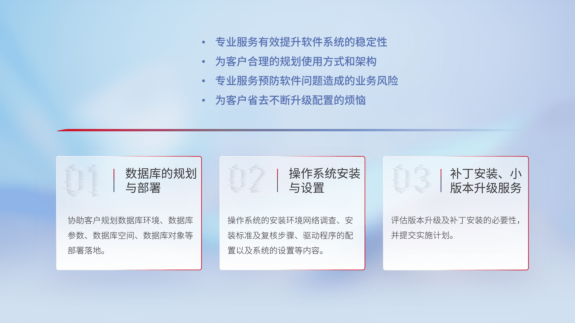 为客户提供软件规模升级、、快速部署、、按需配置的专业服务,,从数据库的规划与部署到操作系统的安装与设置,,,,再到补丁安装和小版本升级提供支持。。