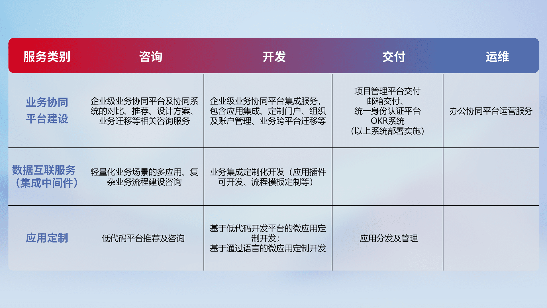 针对钉钉、、、、企微、、、、IDaas等平台级产品提供产品的规划、、、方案、、、交付、、、定制化开发等服务,,,实现如统一协同办公、、、智能客户服务、、混合会议管理、、、智能数据查询、、、、等业务场景,,实现数字化转型。。。